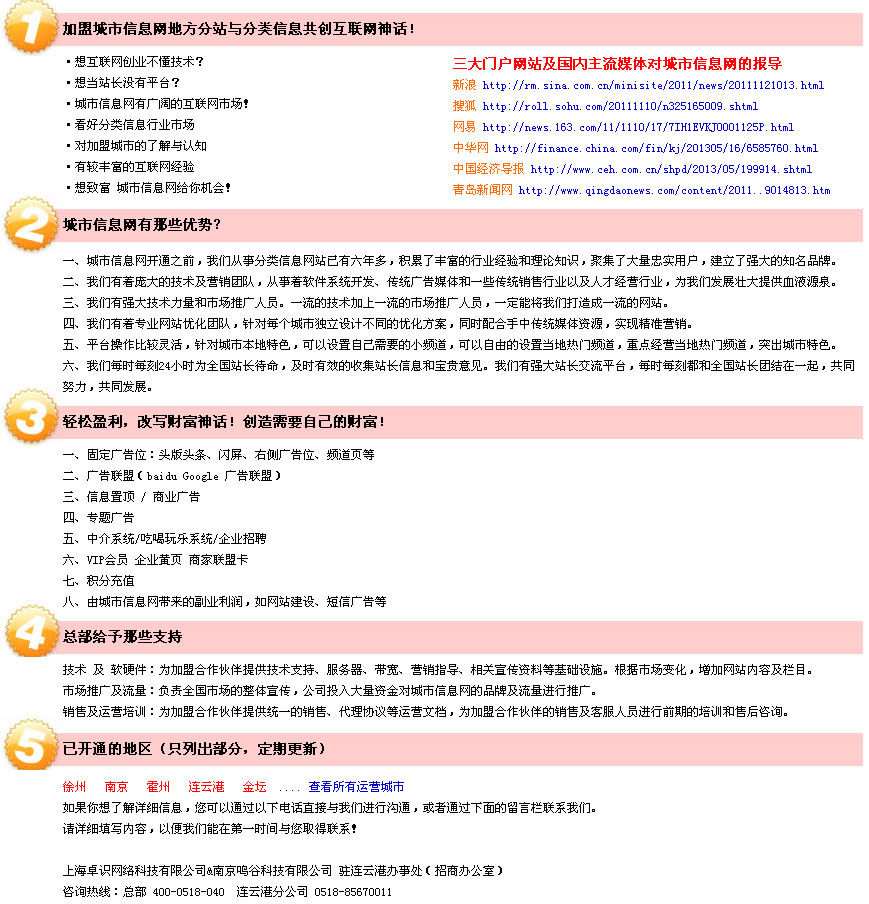 来自:以上为城市信息网招商网的截图,详情请点击查看 http://www.city28.com/zhaoshang/ 城市信息网 诚招各地方分站合作伙伴 媒体支持:新浪网IT频道、网易新闻中心、腾讯科技、搜狐科技、中华网财经频道、电脑报南京站、中国经济导报